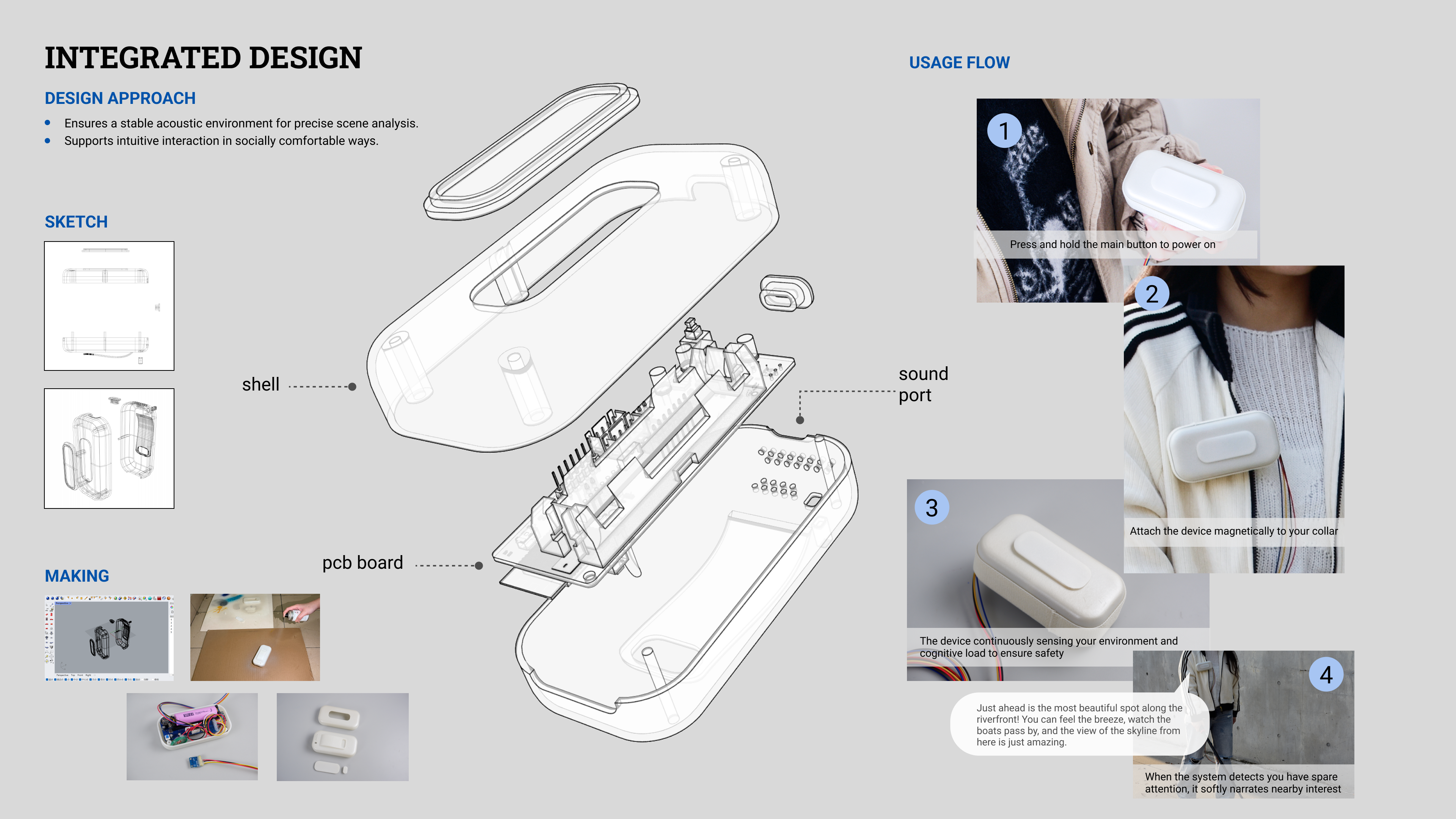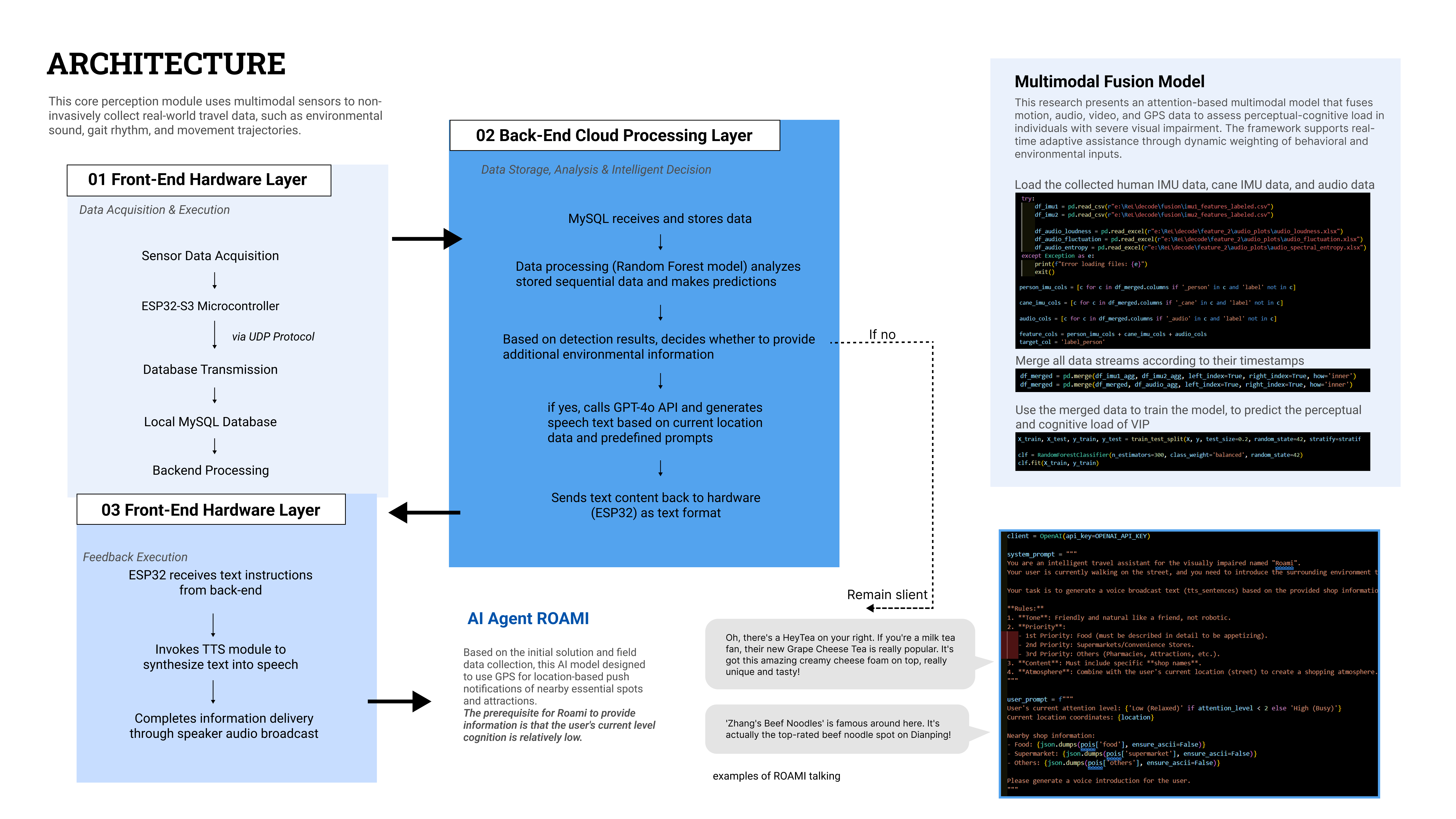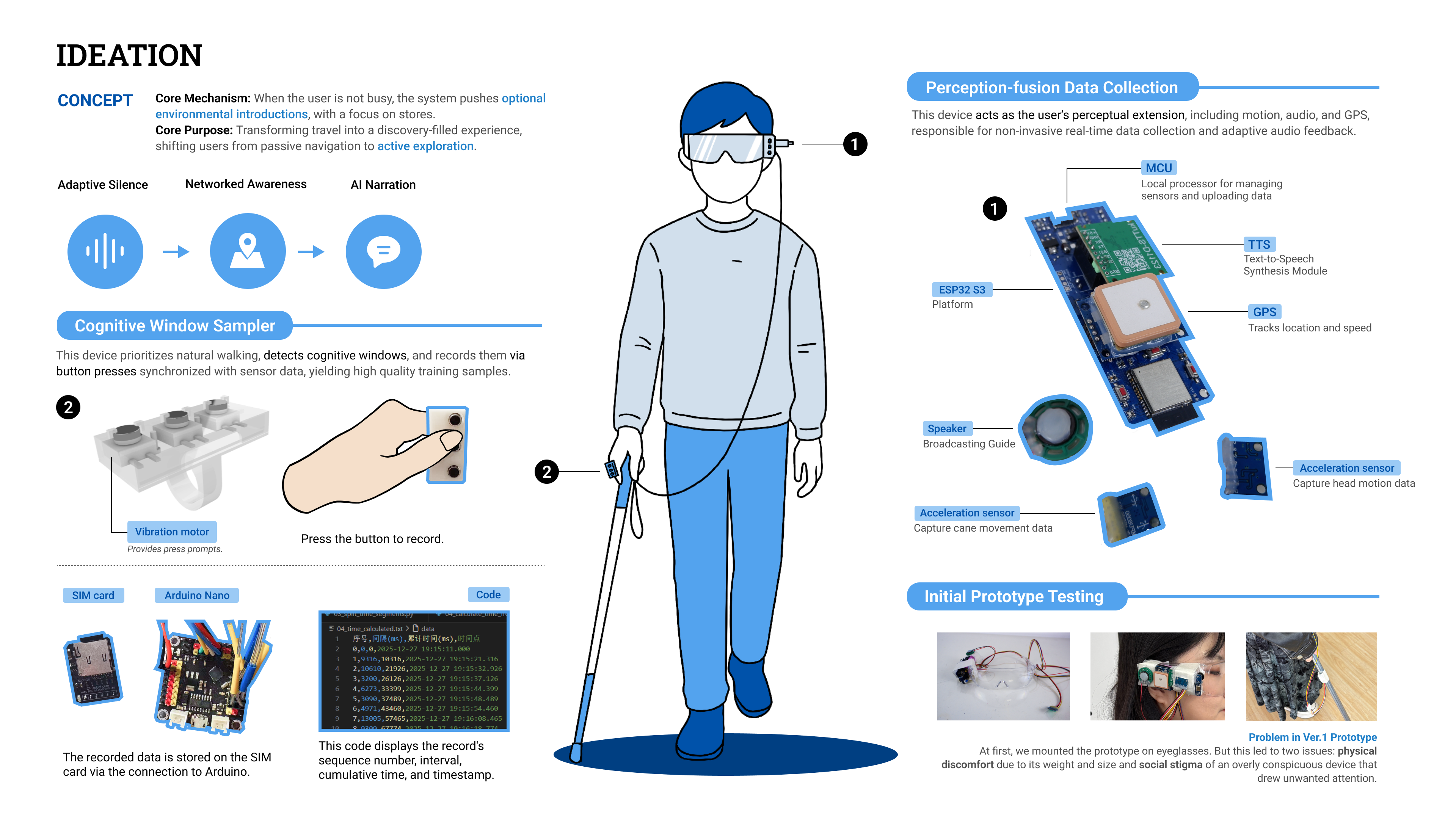 Roami is an adaptive navigation system designed for the visually impaired. It acts as a cognitive partner, intelligently sensing your attention level to ensure safety first. When you’re relaxed, it gently suggests nearby points of interest, like pharmacies or parks, turning travel from a stressful task into a journey of discovery.